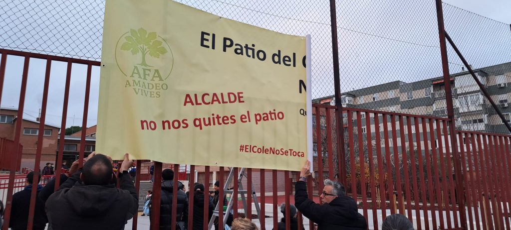Queridas familias. Hemos colocado una pancarta en la valla de nuestro cole en la Calle Yébenes, para que todo el que pase nos oiga gritar que NUESTRO PATIO NO SE TOCA aunque nuestros peques estén disfrutando de sus vacaciones navideñas.